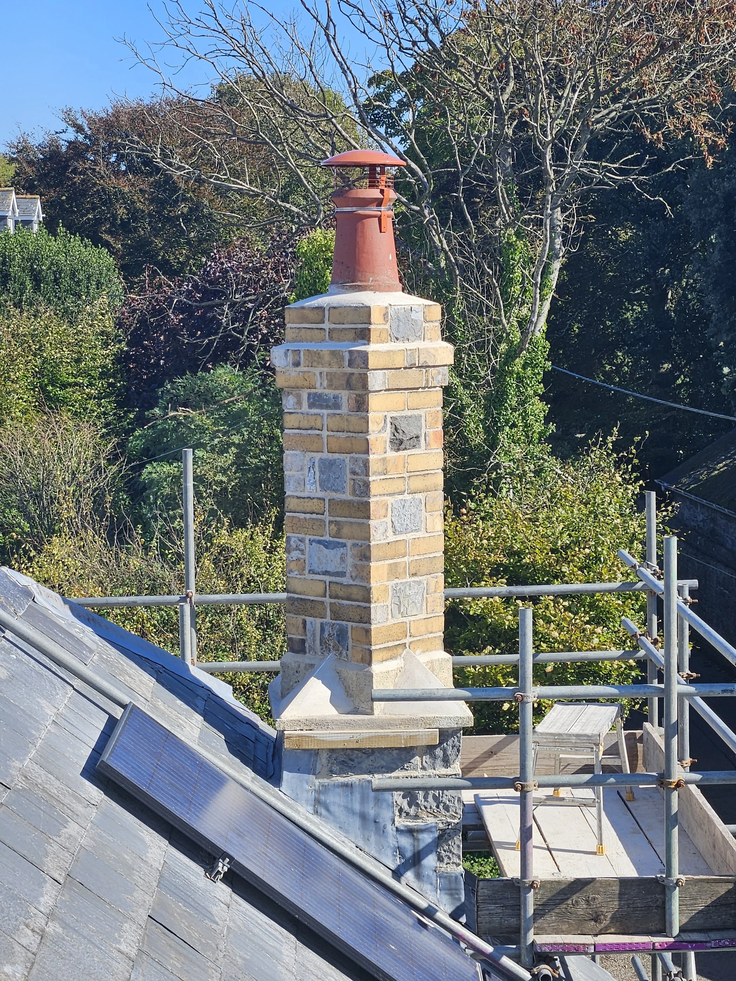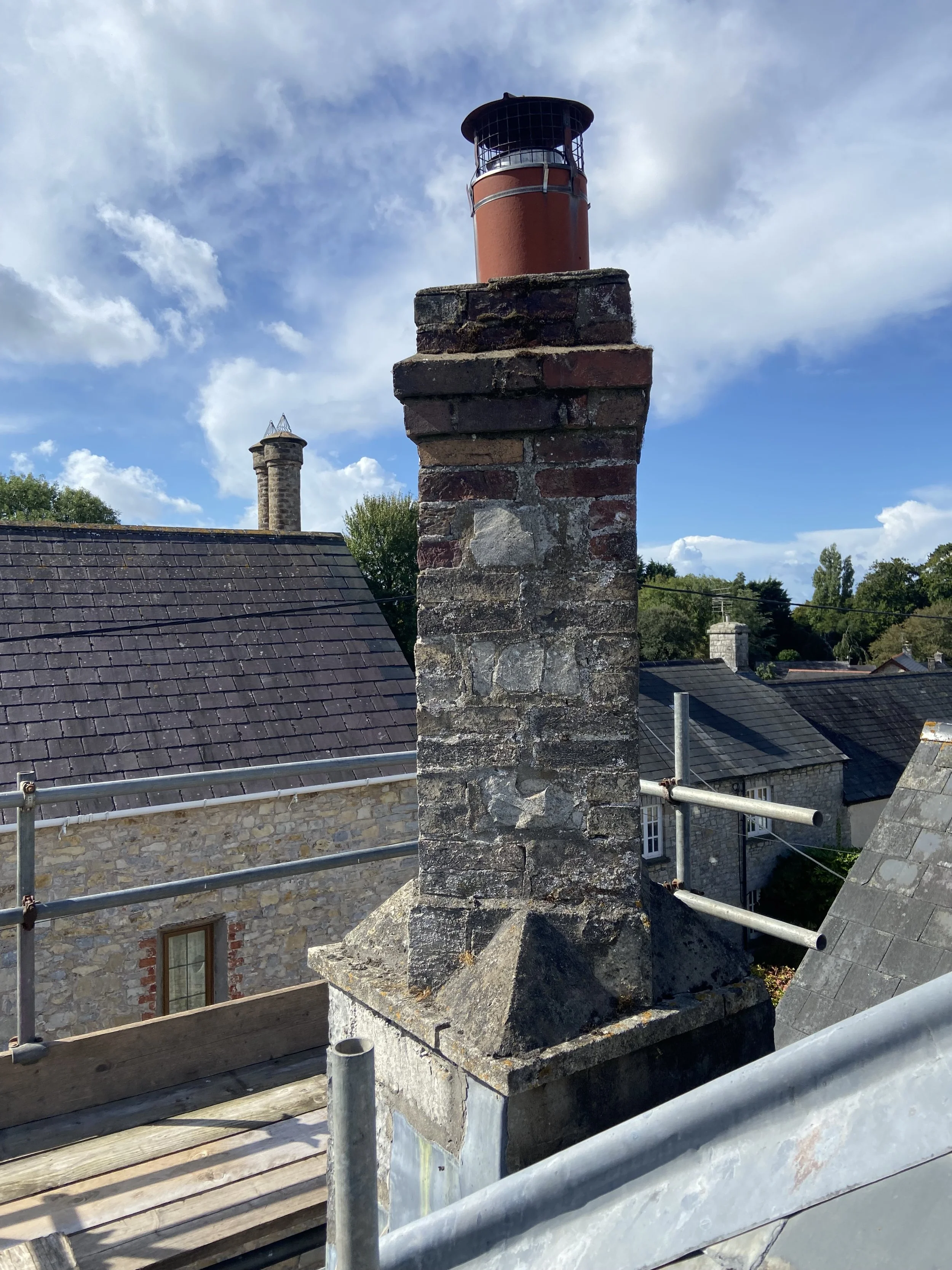 Existing dilapidated chimney reconstructed with reclaimed bricks and recycled stone, pointed and flaunched with lime mortar.